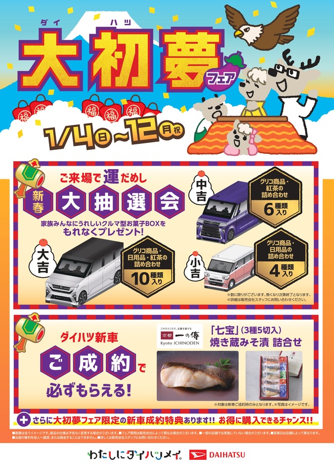 2026年1月4日(日)から12日(月・祝)まで「大初夢フェア」を開催します!新春大抽選会では家族みんなにうれしいクルマ型お菓子BOXをもれなくプレゼント!大吉?中吉?小吉?ご来場で運だめし!