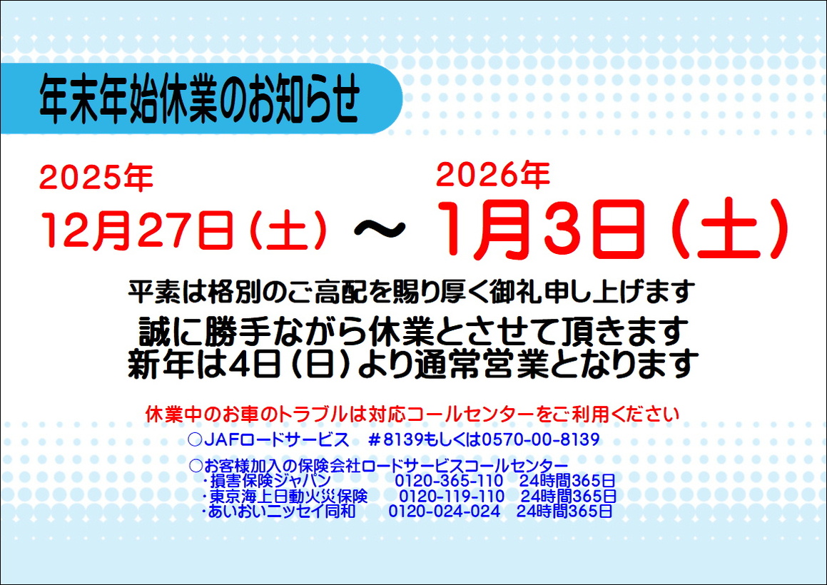 営業時間:※2025年11月1日より 9:00~17:30(車検入庫は9時30分より / 整備入庫は17:00まで)